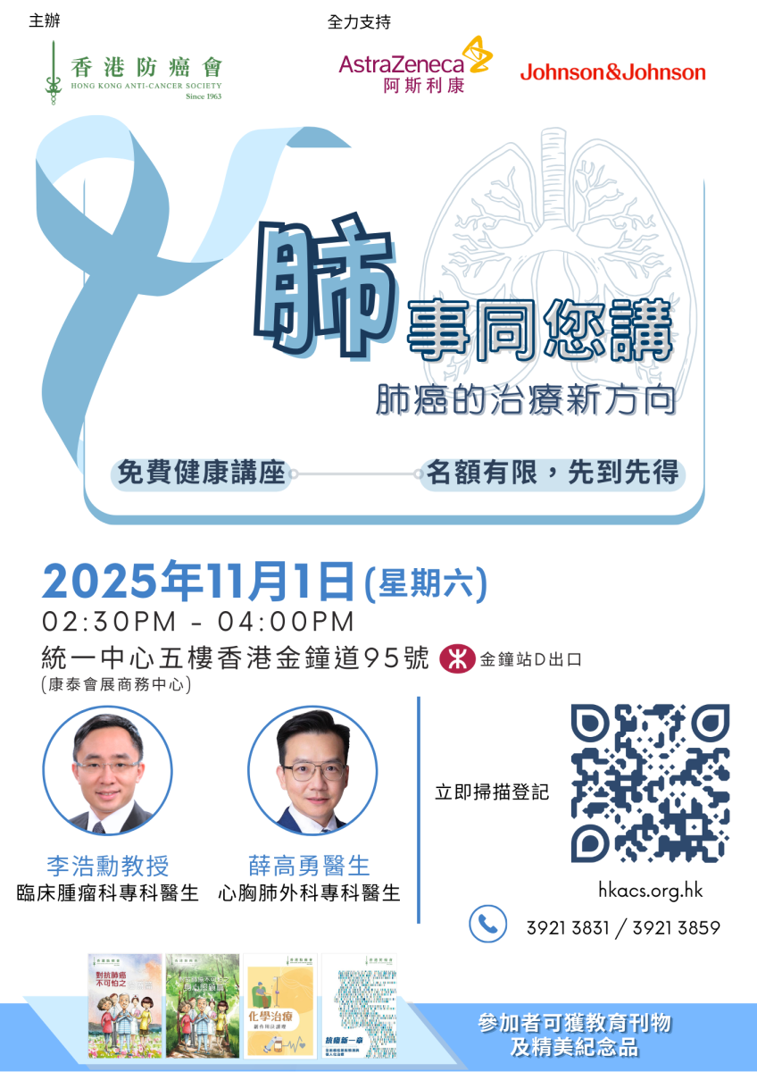 根据香港癌症资料统计中心的资料显示,肺癌每年新症逾 5,000宗,平均每年更夺去4,000人嘅性命,是“香港癌症头号杀手”!随著医学科技不断进步,香港近年在肺癌治疗领域迎来崭新突破,包括精准药物、免疫治疗及个人化治疗方案等新方向,不但延长患者存活期,更大幅提升生活质素。今次健康讲座,我们将聚焦这些创新治疗策略,一同探索肺癌治疗的未来可能。